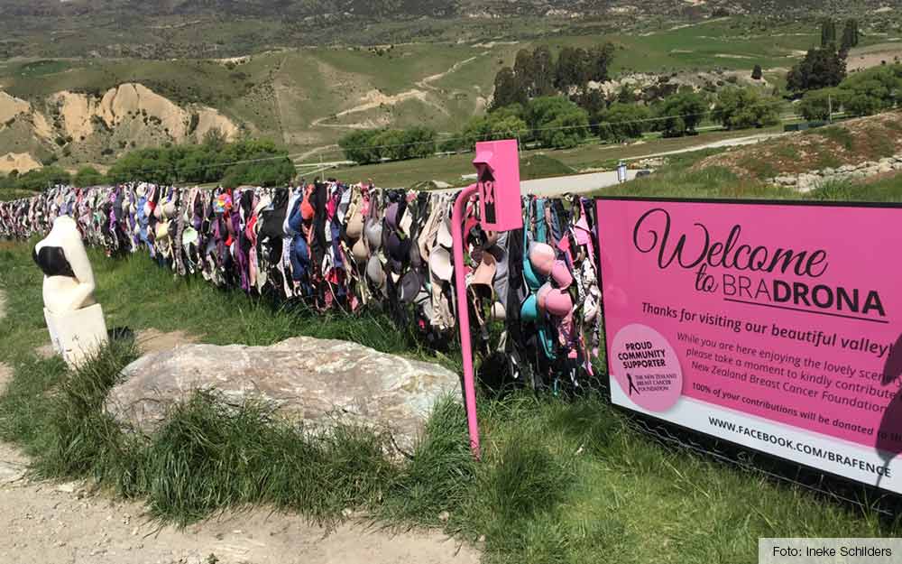 De Cardrona Bra Fence in Central Otago werd al snel een toeristische attractie. De spraakmakende plek werd zo populair dat het damesondergoed voor de verkeersveiligheid verplaatst werd naar een hek langs de oprit van een lokaal koppel wat The Cardrona Horse Trekking & Quadbiking runt. In 2015 promoveerde het hek tot ‘Bradrona’ en er werd een roze donatiebox opgehangen om geld in te zamelen voor de New Zealand Breast Cancer Foundation. Met succes. Daarnaast diende het voor Nieuw-Zeelanders als inspiratie voor hekken vol niet langer dienstdoende tandenborstels, wandelschoenen, rubberlaarzen, slippers, fietsen en wieldoppen verspreid door het land.