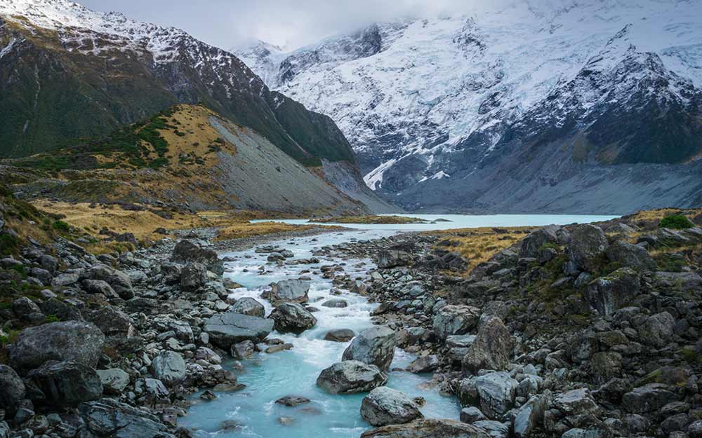 De route leidt je langs met ijsplaten bedekte bergketens. Op de achtergrond het rommelende geluid van lawines in de verte. Je steekt een paar hangbruggen over en wandelt langs kronkelende bergstromen, het Mueller-gletsjermeer en door de Hooker-vallei. Tot je je aan de voet van het met ijsbrokken bespikkelde Hooker Lake staat te vergapen aan het uitzicht op Nieuw-Zeelands hoogste berg Aoraki of Mount Cook.