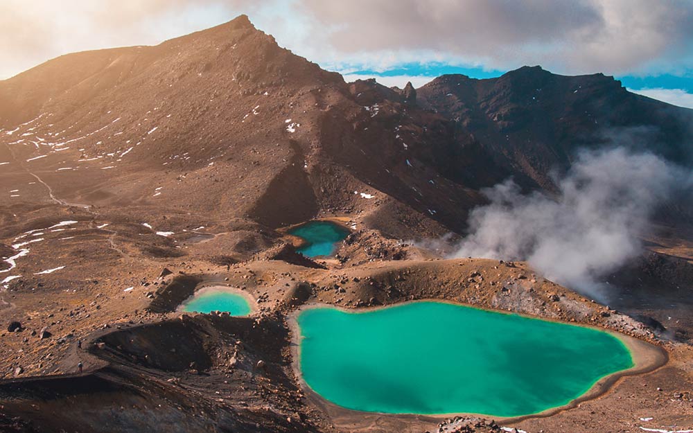 Je passeert Mount Ngauruhoe, overwint de Devil’s Staircase, over uitgeharde lavastromen, klimt door de sneeuw naar de Red Crater Ridge en kijkt vervolgens uit over de groenblauwe Emerald Lakes. De perfecte plek voor een lunchpauze. Je vervolgt de route richting Blue Lake, vanaf waar de drie uur lange afdaling met uitzicht op Lake Rotoaira en in de verte Lake Taupo begint.