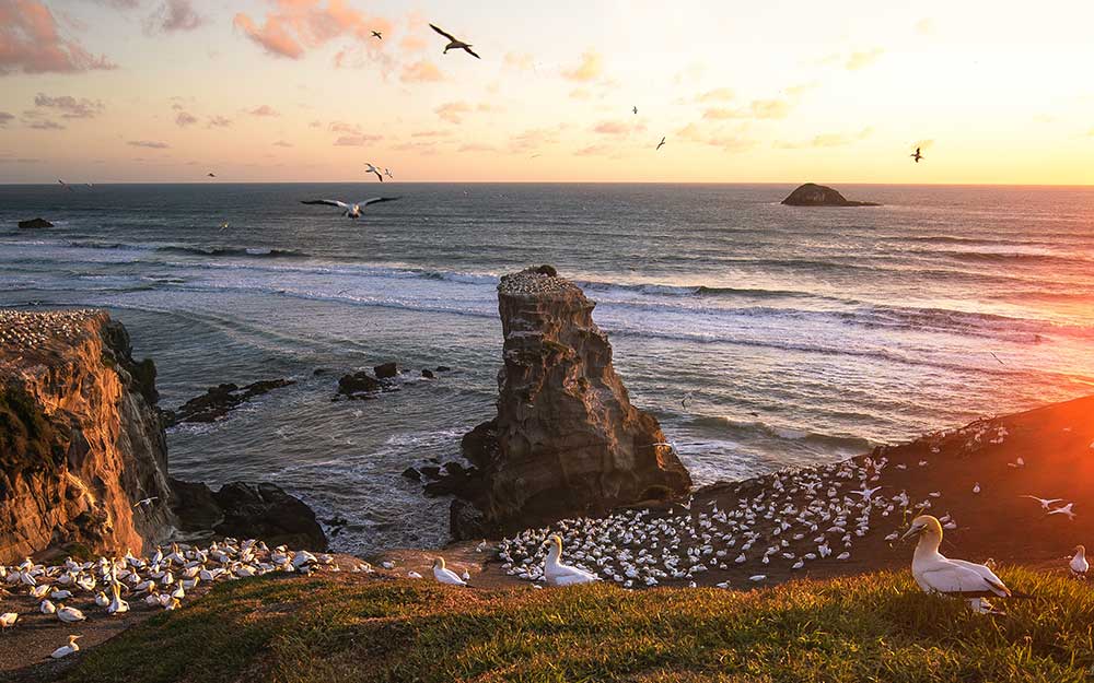 Ieder jaar tussen juli en maart is het een drukte van jewelste op de rotsen bij Muriwai Beach, op een uurtje rijden vanaf Auckland. Een kolonie bestaande uit honderden Jan-van-Genten (gannets) strijkt hier neer om een nest te maken en hun eieren uit te broeden. Vanaf een uitkijkplatform kun je de zeevogels goed observeren. Andere broedplaatsen van de Jan-van-Gent vind je bij Farewell Spit op het Zuidereiland en bij Cape Kidnappers aan de westkust van het Noordereiland.