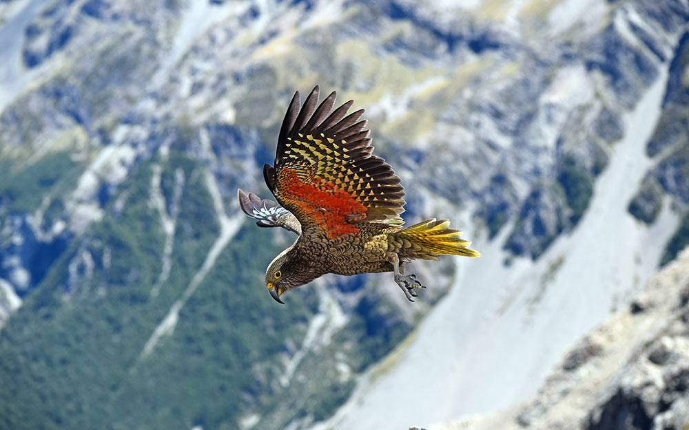 Als enige bergpapegaai ter wereld behoort de kea absoluut in deze lijst van meest bijzondere dieren in Nieuw-Zeeland. Hoewel hij bedreigd wordt en alleen op het Zuidereiland voorkomt, is hij brutaal genoeg om zich te laten zien. Hij pikt namelijk graag een kruimeltje mee of knabbelt aan je auto. Opletten dus, want de kea voeren is niet toegestaan. De grootste kans om deze slimmerik te spotten heb je bij Mount Cook, in Arthur’s Pass en Fiordland National Park. Je herkent hem aan zijn groenbruine veren en feloranje ondervleugels.